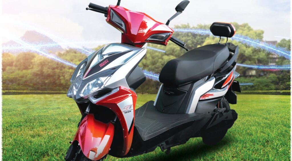 NEON Electric Scooter – 110–120 km range, BLDC motor, 2-seater, digital display, multi ride modes, 10″ alloy wheels, dual disc brakes, smart controller, and advanced safety features.