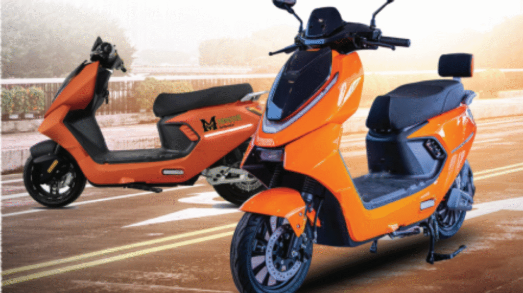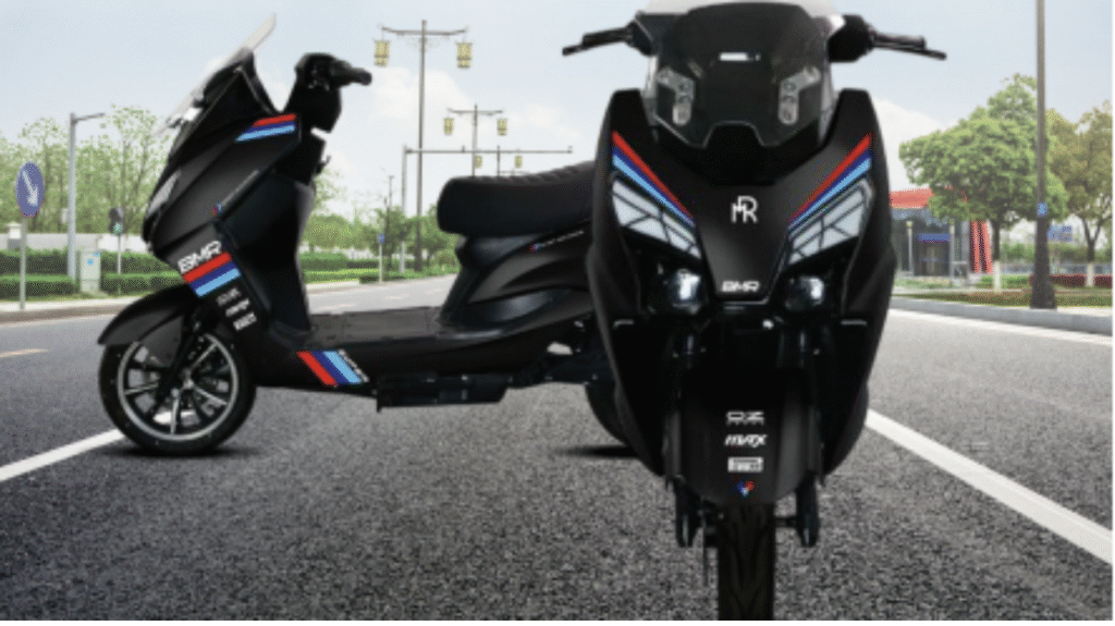 BMR Electric Scooter – 100–110 km range, BLDC motor, 2-seater, digital display, multi ride modes, 12″ alloy wheels, dual disc brakes, smart controller, and advanced safety features.