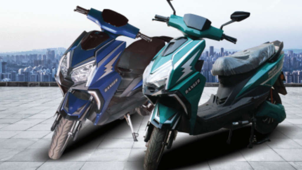 RANGER Electric Scooter – 100–110 km range, BLDC motor, 2-seater, digital display, multi ride modes, 12″ alloy wheels, disc-drum brakes, smart controller, and advanced safety features.